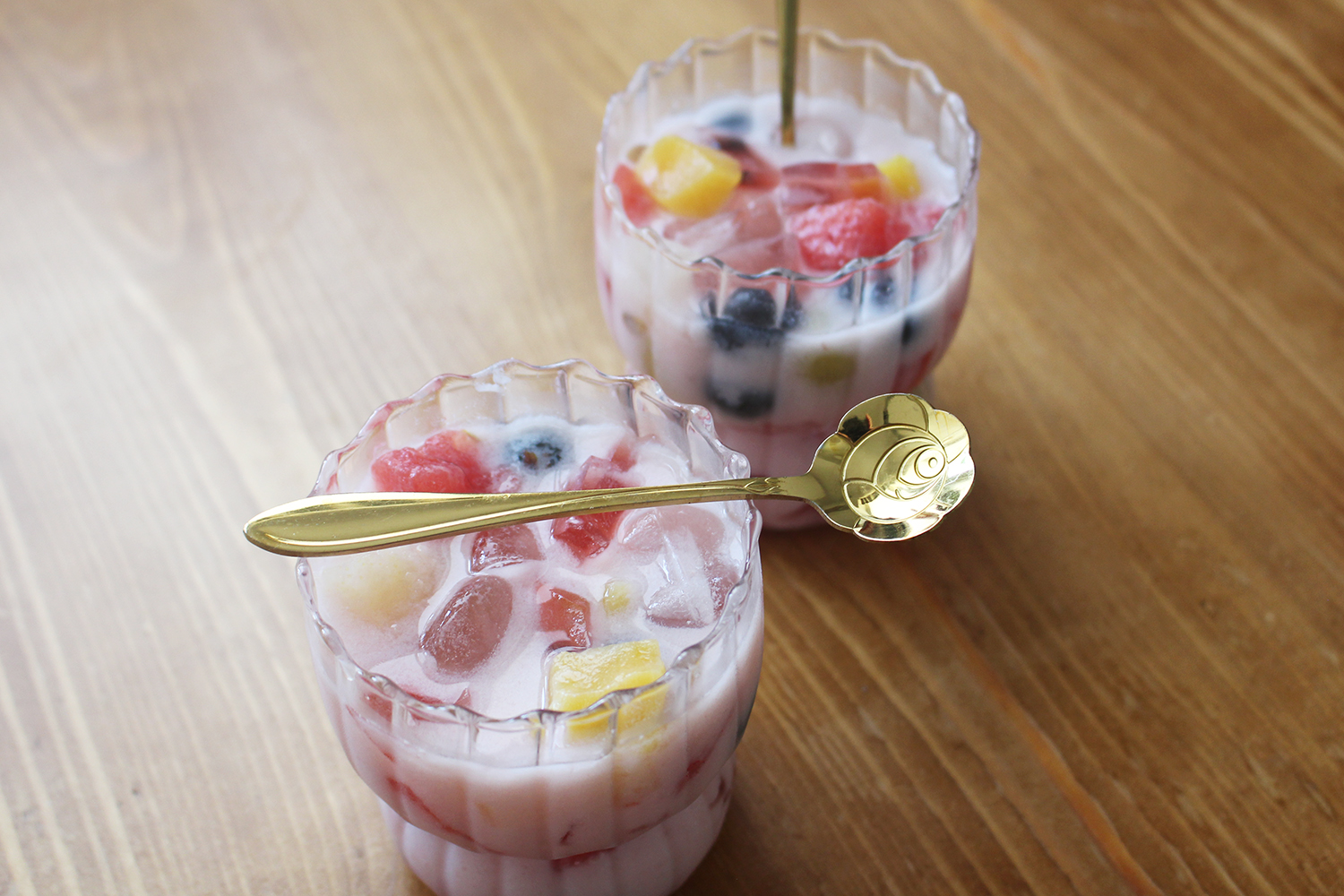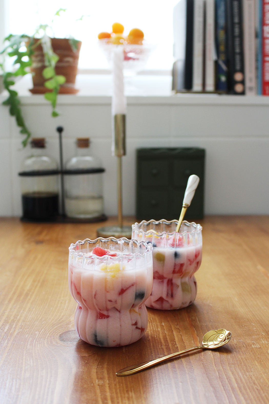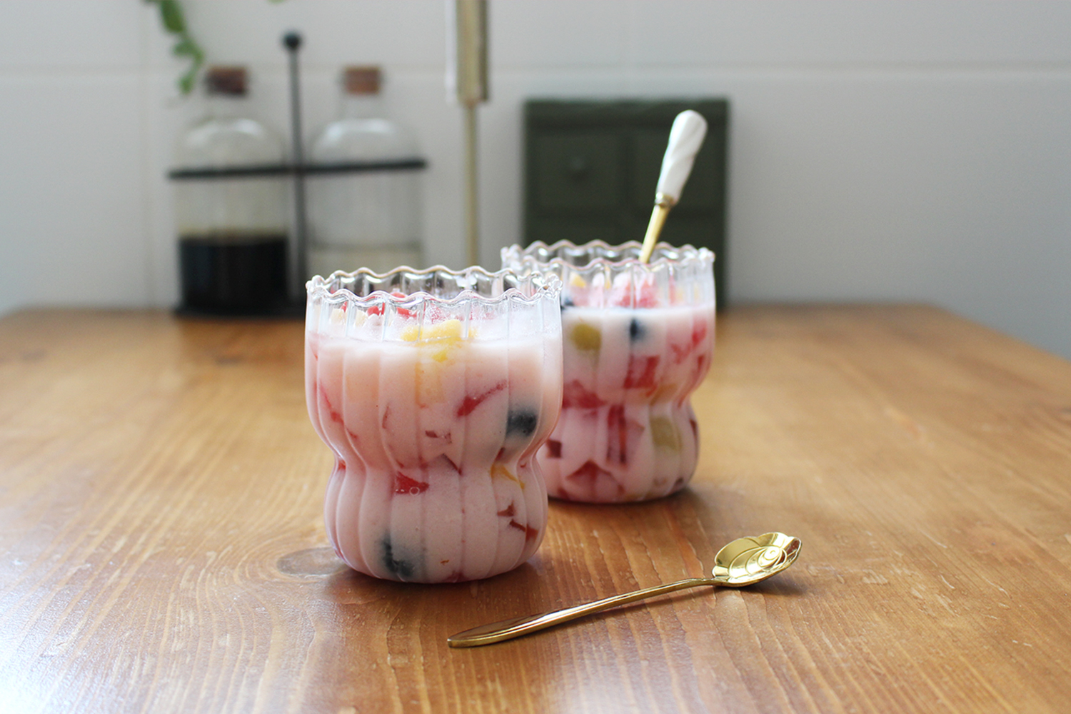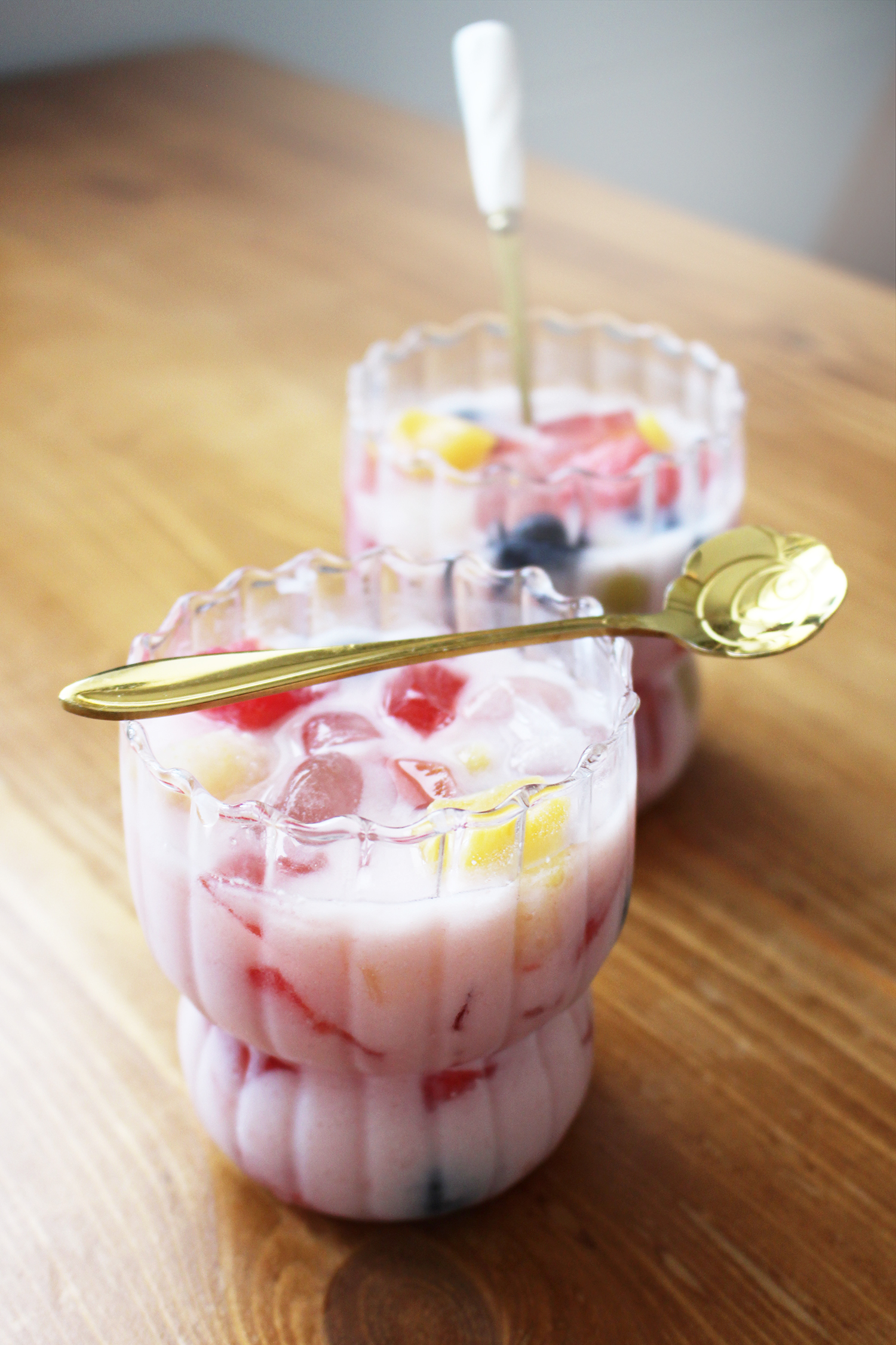 - Pokrojona w kostkę truskawkowa galaretka, skroiłam o napoju tylko połowę (u mnie truskawkowa, zrobiona z odrobiną mniej wody niż w przepisie, aby była bardziej zwarta)