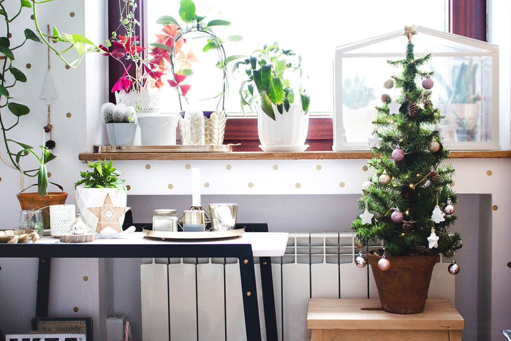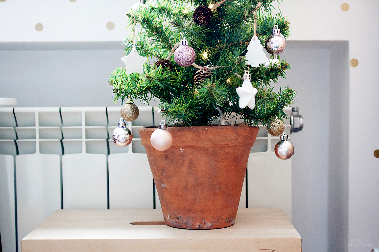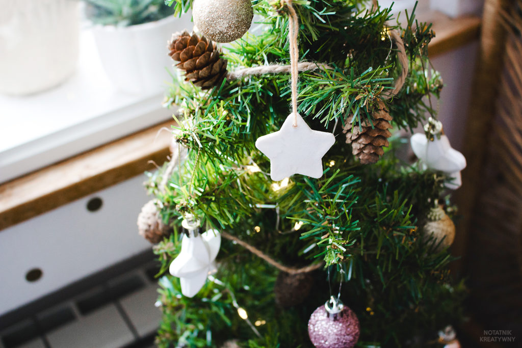 Choinkę ubrałam w szyszkową girlandę z TEGO posta, dodatkowo użyłam minimalistycznych ozdób z masy solnej, którym planuje poświęcić kolejny post. Dla równowagi bombki z brokatem, a jakże, różowe 🙂