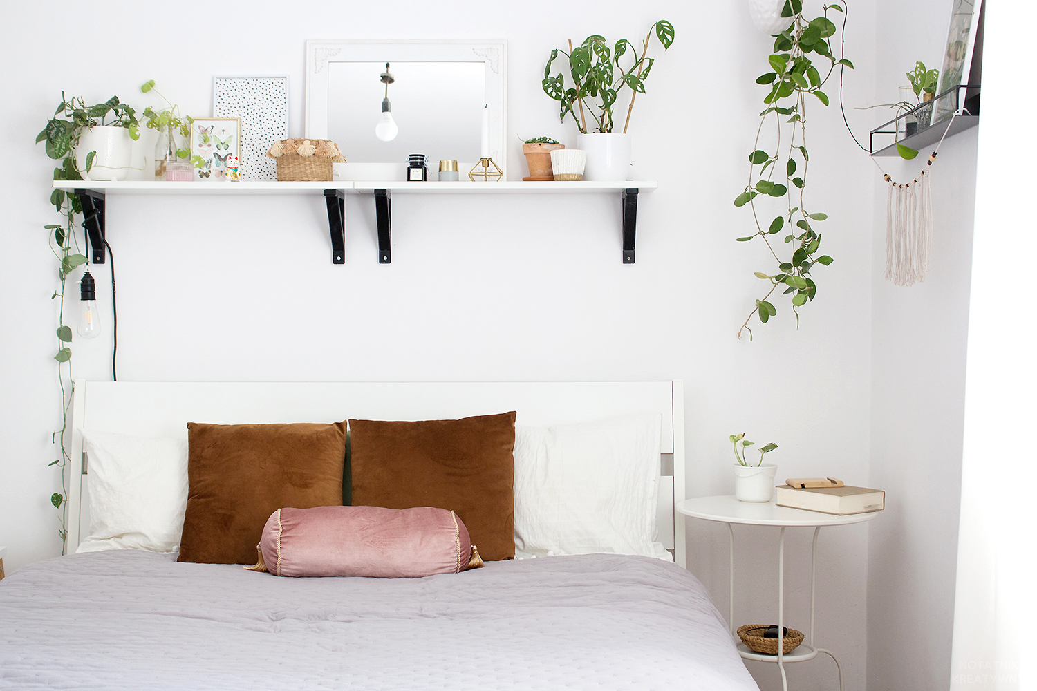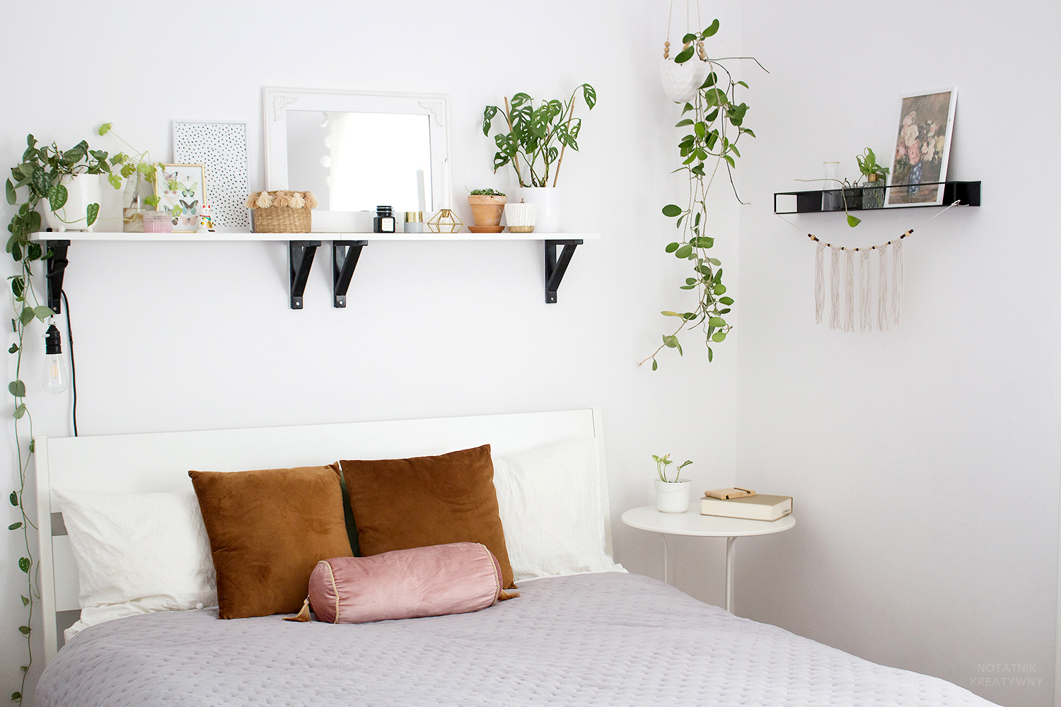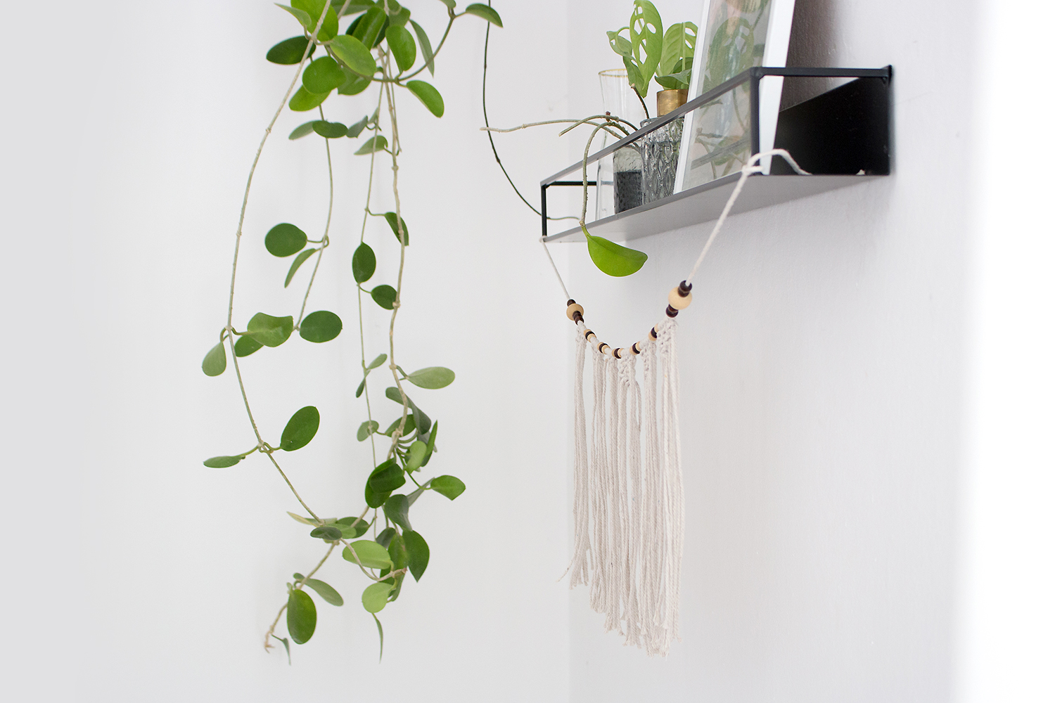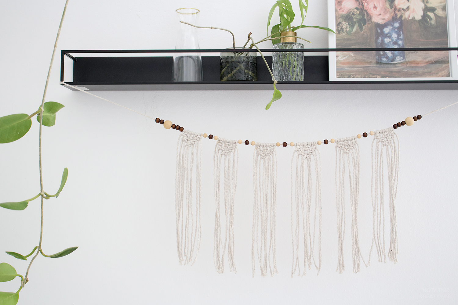 Mam taka ścianę w sypialni, na której znajdowała się tylko półka ze szczepkami roślin, nic ponad to. Nie dawało mi to spokoju, bo taka brzydka i łysa ta ściana była, za grosz charakteru. Wpadłam więc na pomysł, aby pod półką zawiesić jakieś ładne, makramowe ”dyndadełko”. Pierwotnie miałam to dyndadełko zakupić, ale jak to z makramowymi wyrobami bywa, nie są to tanie rzeczy, zawsze znajdowały się więc ważniejsze wydatki. I tak dni mijały, ściana nie piękniała, aż w końcu powiedziałam więc tej problematycznej ścianie basta- zaparłam się, że jak tak to sama coś dla niej zrobię, przysiadłam do pracy i tak oto uplotłam własną makramową ozdobę, z której jestem teraz niezmiernie dumna! 😀
